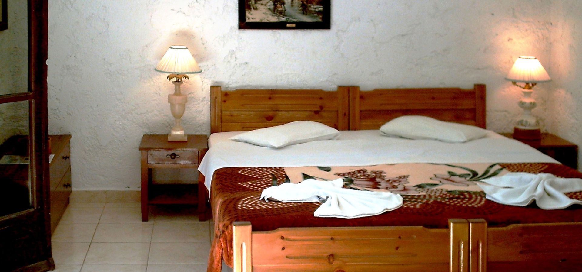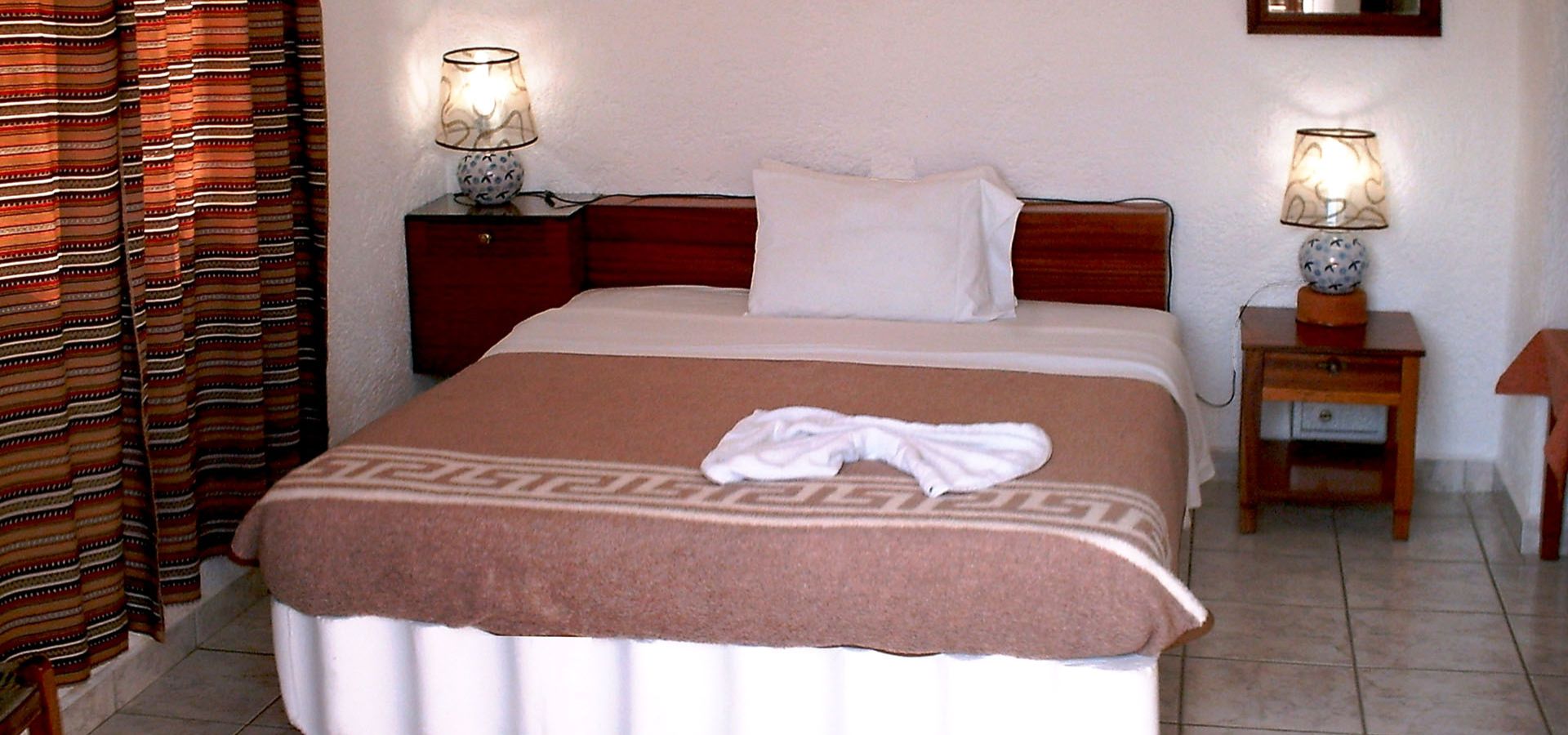 Set around a pretty, flower filled courtyard and orange grove, our pleasantly light, well kept guesthouse has 5 simply furnished, but nicely decorated private bedrooms for triple occupancy. Most of the rooms have shared balconies or open terraces whilst others on the ground floor, that face onto the gardens, have a patio area and plenty of outdoor space to relax in. We offer the choice for rooms with one double and one single bed, or with three single beds to choose from. The simple, traditional interiors are cool and a wall fitted fan in each bedroom adds an extra degree of comfort during the warm summer days.